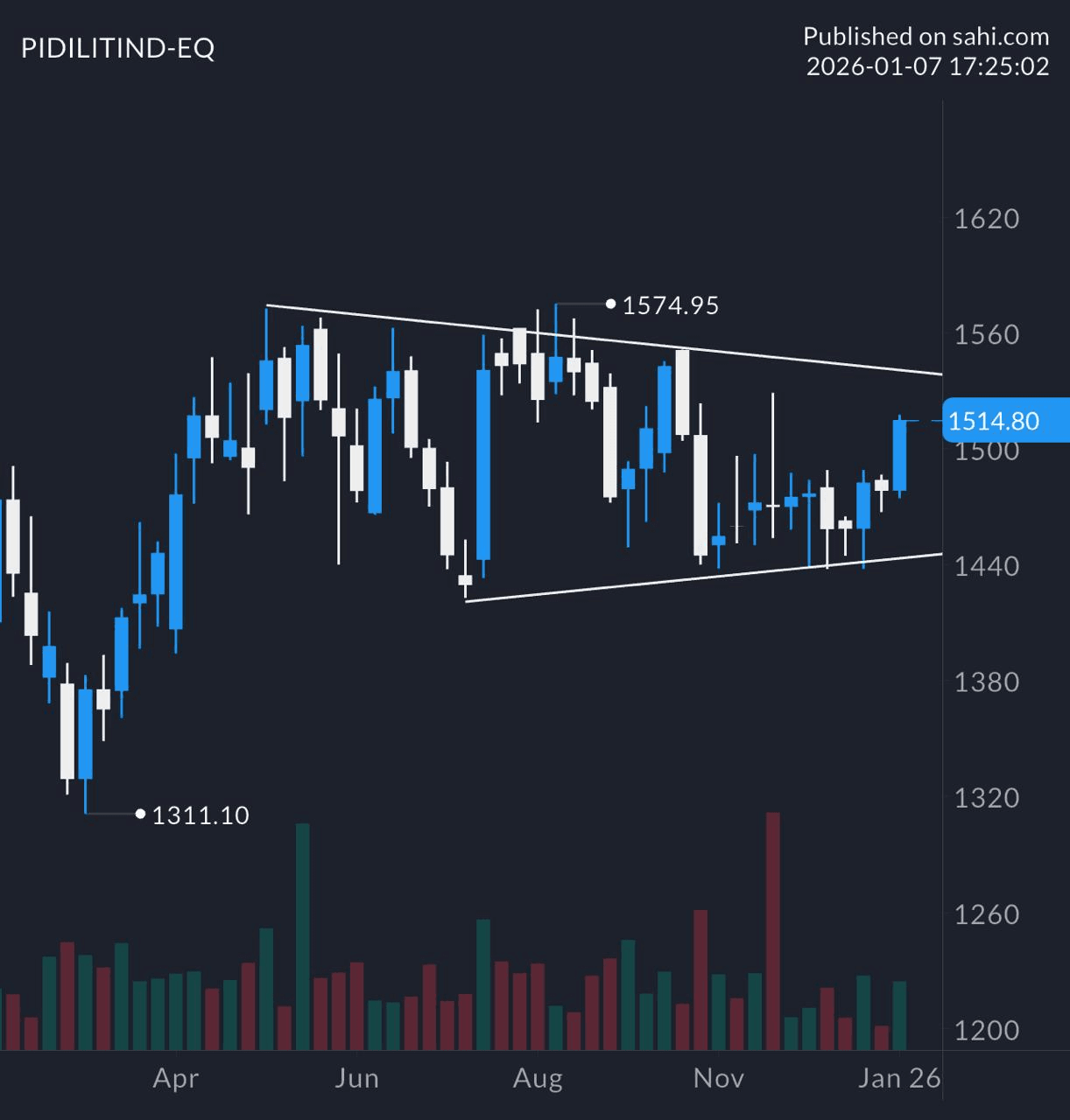 | PERSISTENT | +4.23% | Trading near upper consolidation band; breakout above 6,600 awaited |