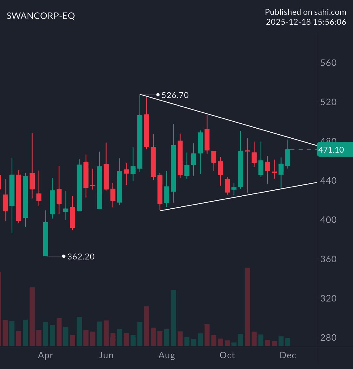 Structure: Price compresses between converging trendlines, signalling balance and indecision.