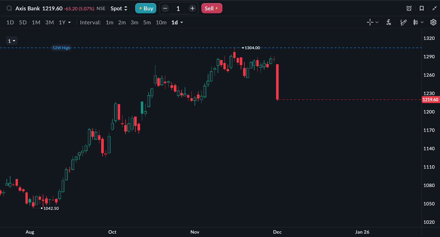 Axis Bank shares slipped to the ₹1,220–₹1,230 range, down from a previous close near ₹1,285, while Bank Nifty declined about 0.6% to trade around 59,107.
